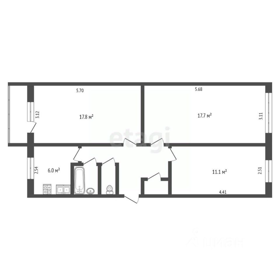- Общая площадь 63.8 кв.м, при этом комнаты просторные: 17.8 кв.м, 17.7 кв.м и 11.1 кв.м, обеспечивают массу пространства для вашего комфорта.