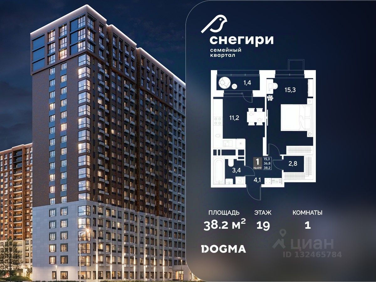 В продаже 1-комнатная квартира от застройщика DOGMA! ЖК "Снегири", г. Омск, Литер 1 Срок сдачи: (4 кв. 2027, общей площадью 38.2 кв.м., на 19 этаже.) Район для счастливой жизни