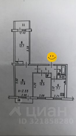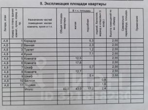 Общая площадь составляет 60 кв. м, жилая площадь — 43 кв. м, а кухня — 7.1 кв. м.