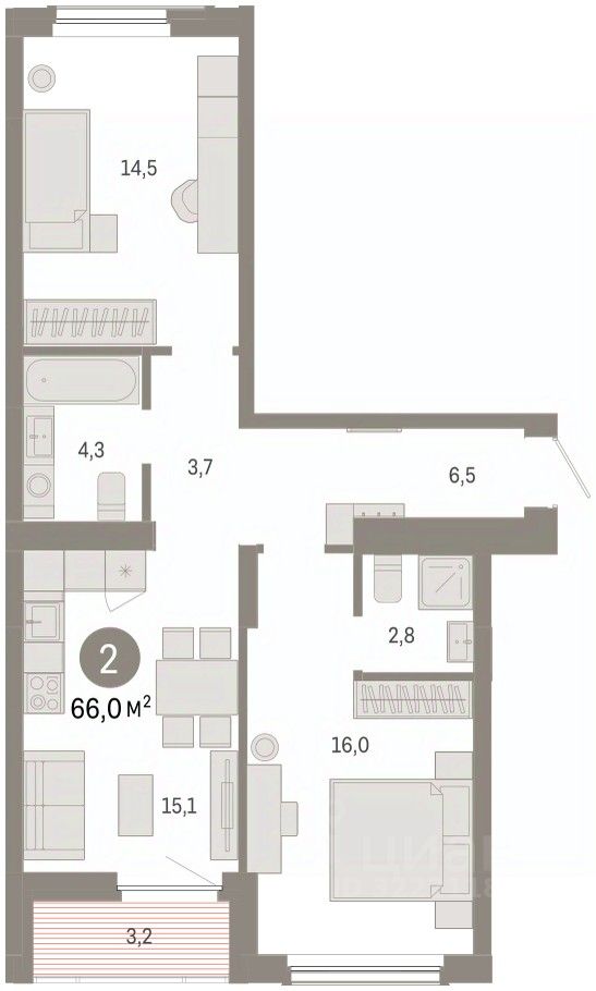 2-комн. квартира с предчистовой отделкой в Кварталы Драверта на 4 этаже. Общая площадь: 66 кв.м. Высота потолков 2.82 м.