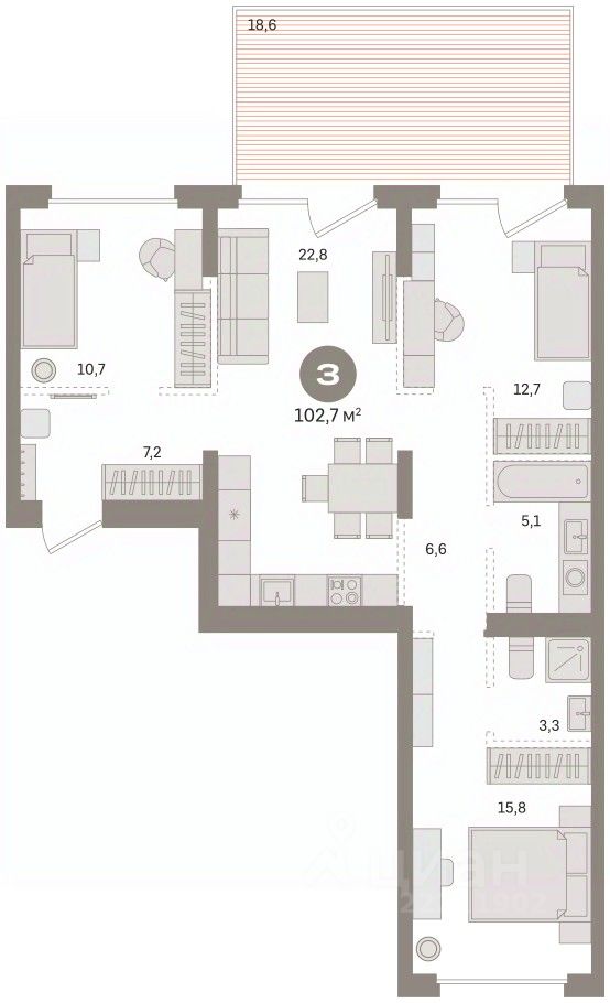 Квартира с кухней-гостиной и тремя спальнями в Кварталах Драверта. Особенности планировки: окна на две стороны, окна в пол, вид во двор, панорамное остекление, свободная планировка, разнесённые спальни, мастер-спальня, терраса.