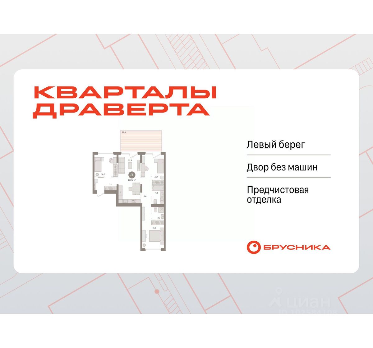 Продается 3-комн. квартира с предчистовой отделкой в Кварталы Драверта на 2 этаже. Общая площадь: 102.68 кв.м. Высота потолков 2.82 м.