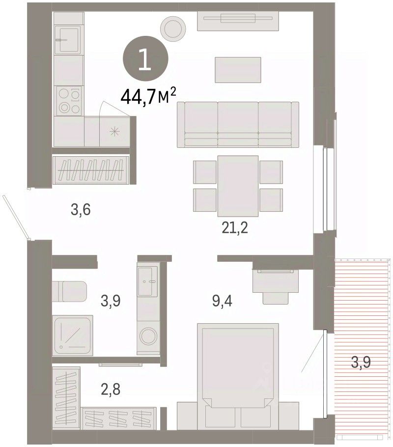 Просторная однокомнатная квартира с предчистовой отделкой в Кварталы Драверта на 5 этаже. Общая площадь: 44.73 кв.м., жилая: 9.4 кв.м., площадь просторной кухни-гостиной: 21.2 кв.м. Все окна выходят на одну сторону. В квартире один балкон, один совмещенный санузел. Высота потолков 2.82 м.
