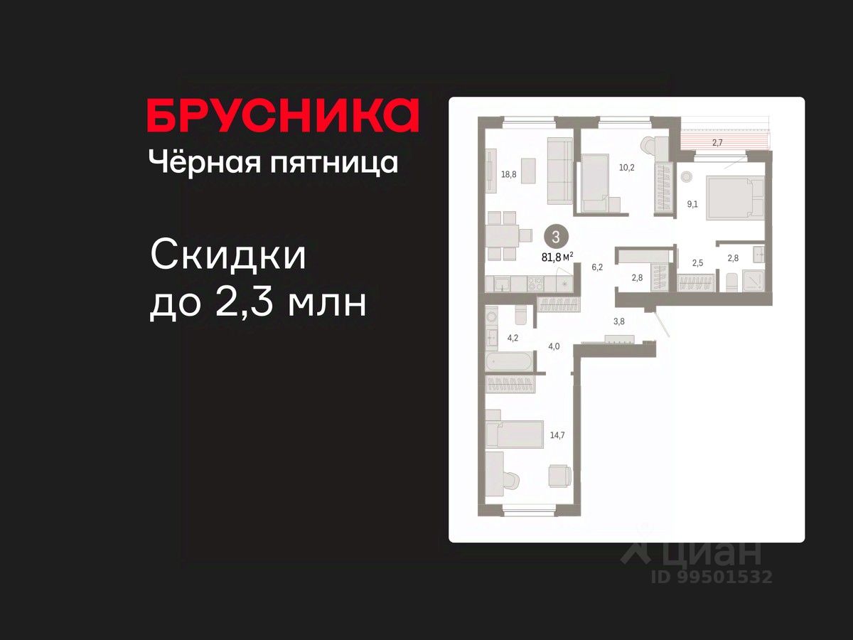 Квартира с кухней-гостиной и тремя спальнями в Кварталах Драверта. Особенности планировки: окна на две стороны, гардеробная, вид во двор, разнесённые спальни, предчистовая отделка, мастер-спальня, терраса на крыше.