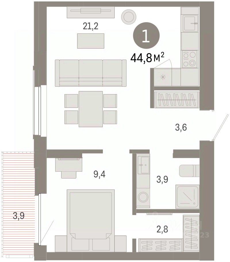 1-комн. квартира от застройщика с предчистовой отделкой в Кварталы Драверта на 5 этаже. Общая площадь: 44.75 кв.м., жилая: 9.4 кв.м., площадь просторной кухни-гостиной: 21.2 кв.м. Все окна выходят на одну сторону. В квартире один балкон, один совмещенный санузел. Высота потолков 2.82 м.