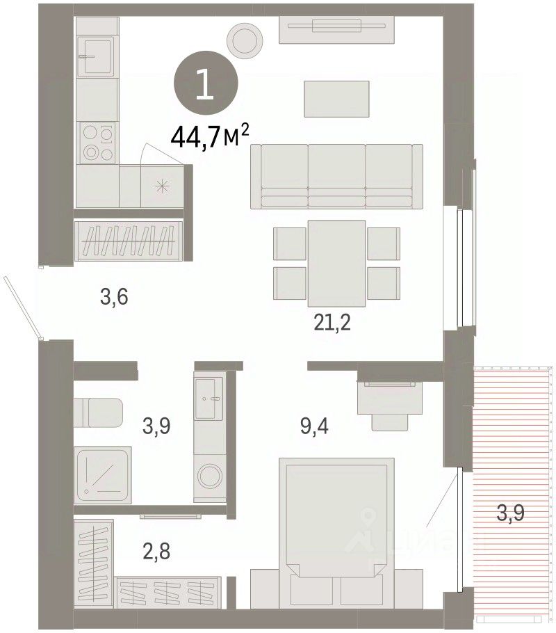 1-комн. квартира с предчистовой отделкой в Кварталы Драверта на 5 этаже. Общая площадь: 44.73 кв.м., жилая: 9.4 кв.м., площадь просторной кухни-гостиной: 21.2 кв.м. Все окна выходят на одну сторону. В квартире один балкон, один совмещенный санузел. Высота потолков 2.82 м.