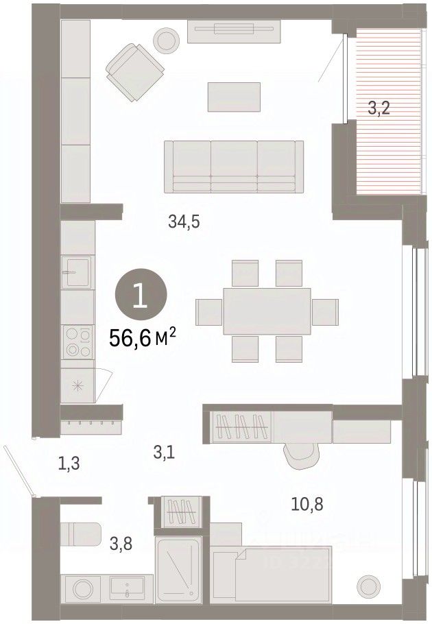 Квартира с кухней-гостиной и одной спальней в Кварталах Драверта. Особенности планировки: тёплая лоджия, разнесённые спальни, предчистовая отделка.