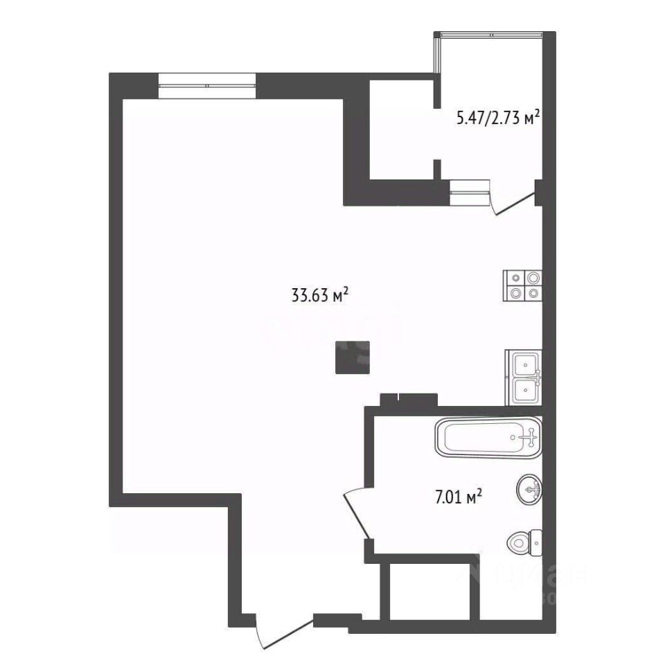 Изолированная комната 21 м², кухня 12 м², потолки 2,7 м, остеклённый балкон. Санузел с сантехникой.