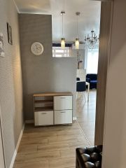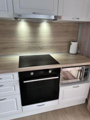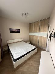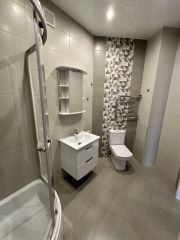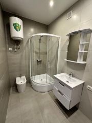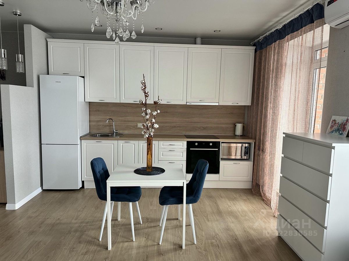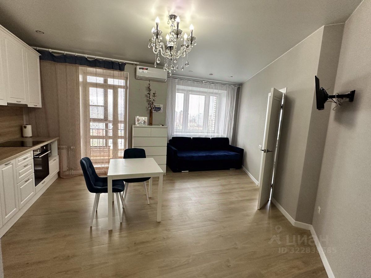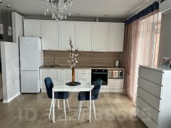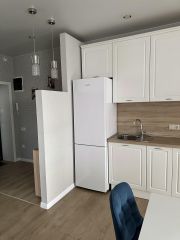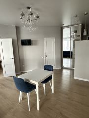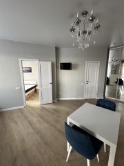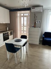 Площадь квартиры 44 м2. Квартира состоит из просторной кухни-гостиной и полноценной спальни с 2-х спальной кроватью и большим встроенным шкафом. В квартире произведен ремонт высококачественными материалами, установлено современное оборудование и сантехника. В кухонной зоне большой кухонный гарнитур с большим новым холодильником, стиральной машиной, электрической плитой, духовкой, микроволновой печью. В гостиной зоне стоит диван, дающий дополнительное полноценное спальное место, телевизор. Квартира освещается хрустальной люстрой, хрустальными подвесными и современными светильниками. Вся мебель, техника и светильники остается покупателю.