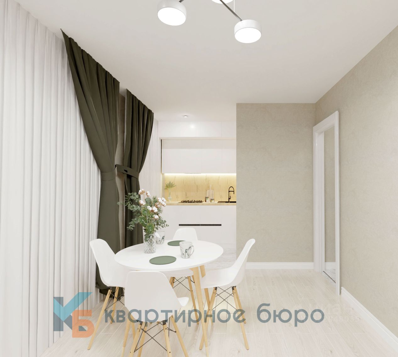 Диван, обеденная зона, предметы интерьера и декора, светильники, текстиль на окнах