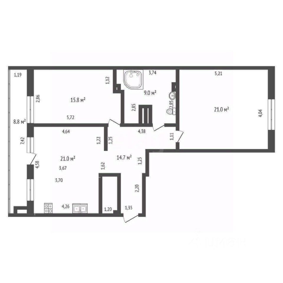 - В подарок вам достанется новый кухонный гарнитур с встроенной бытовой техникой и стильные шкафы-купе, которые идеально впишутся в интерьер. Удобная планировка включает объединенную кухню-студию площадью 21 м², отдельную спальню и уютный зал, а также большой застекленный балкон с выходом из кухни, где приятно проводить время за чашечкой кофе.