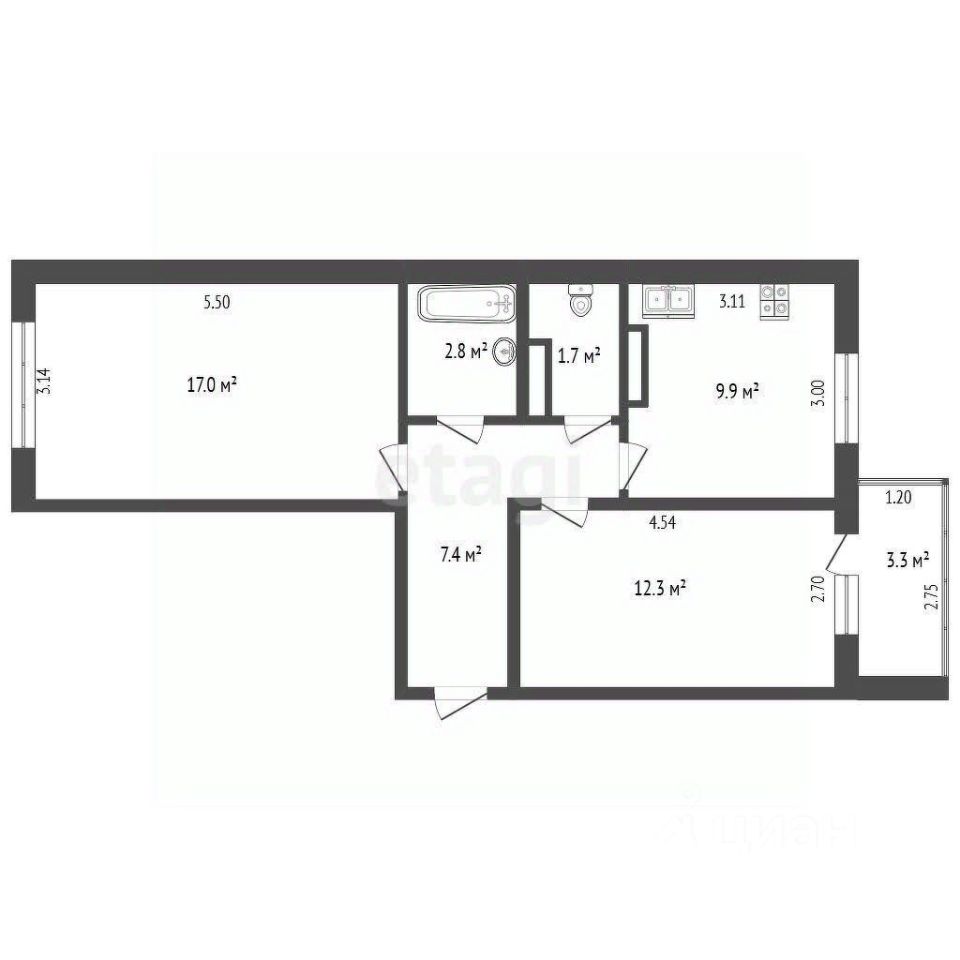 Общая площадь — 50,5 квадратных метров.