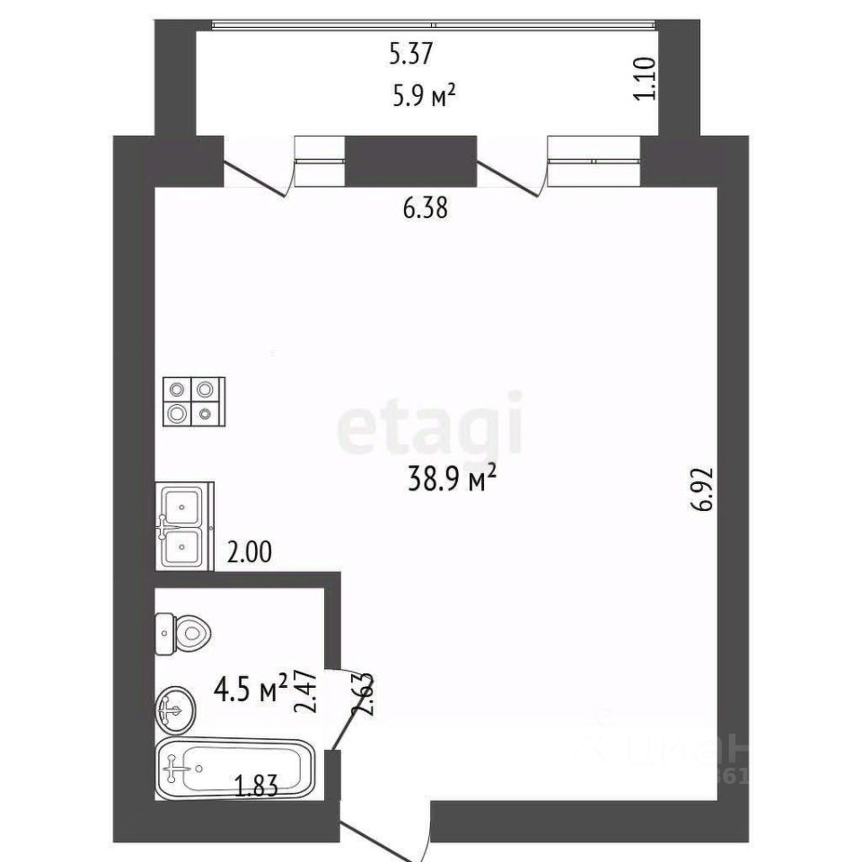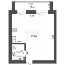 Квартира площадью 43,4 кв.м. с 2 окнами и большой застекленной лоджией, свободная планировка.