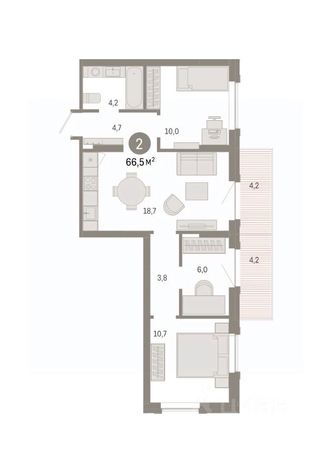 Квартира с кухней-гостиной и тремя спальнями в Кварталах Драверта. Особенности планировки: новые лоты, рабочий кабинет, разнесённые спальни, предчистовая отделка, балкон.