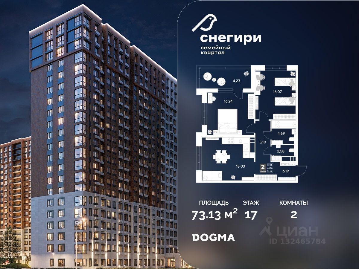 В продаже 2-комнатная квартира от застройщика DOGMA! ЖК "Снегири", г. Омск, Литер 2 Срок сдачи: (4 кв. 2027, общей площадью 73.13 кв.м., на 17 этаже.) Район для счастливой жизни
