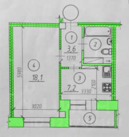 Комната прямоугольной формы площадью 18.1 кв.м. ( 5.98 м 3.02 м ), кухня 7.2 кв.м. ( 2.1 м 3.33 м ), санузел совмещённый 3.8 кв.м., коридор 3.6 кв.м..