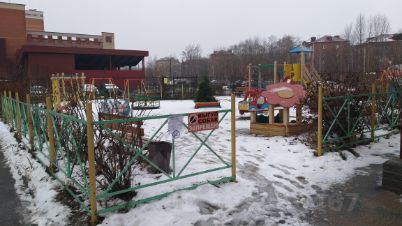 Прилегающая территория с детской игровой площадкой у дома огорожена металлическим забором.