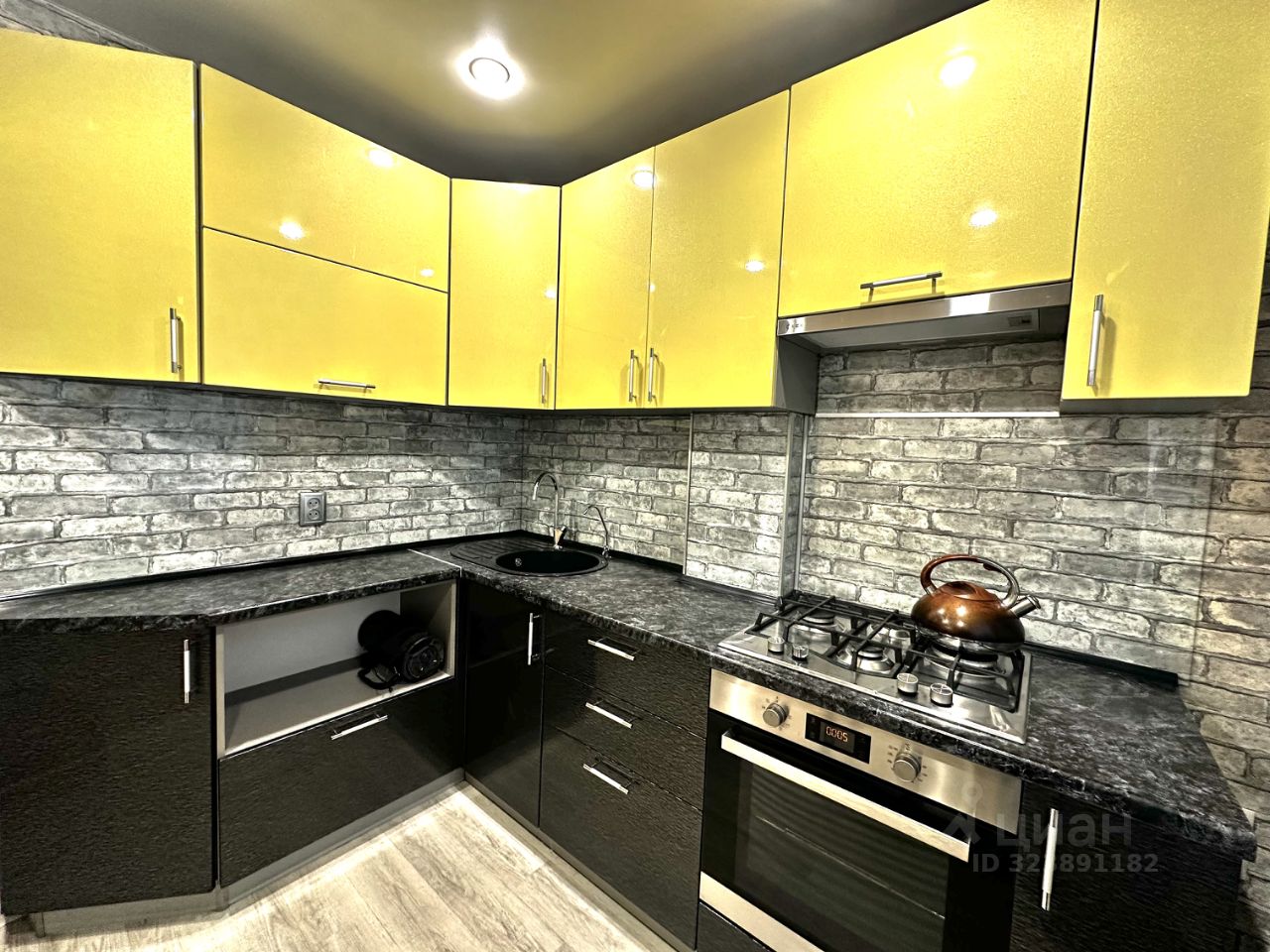 При продаже остается добротный кухонный гарнитур со встроенной техникой.