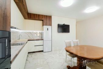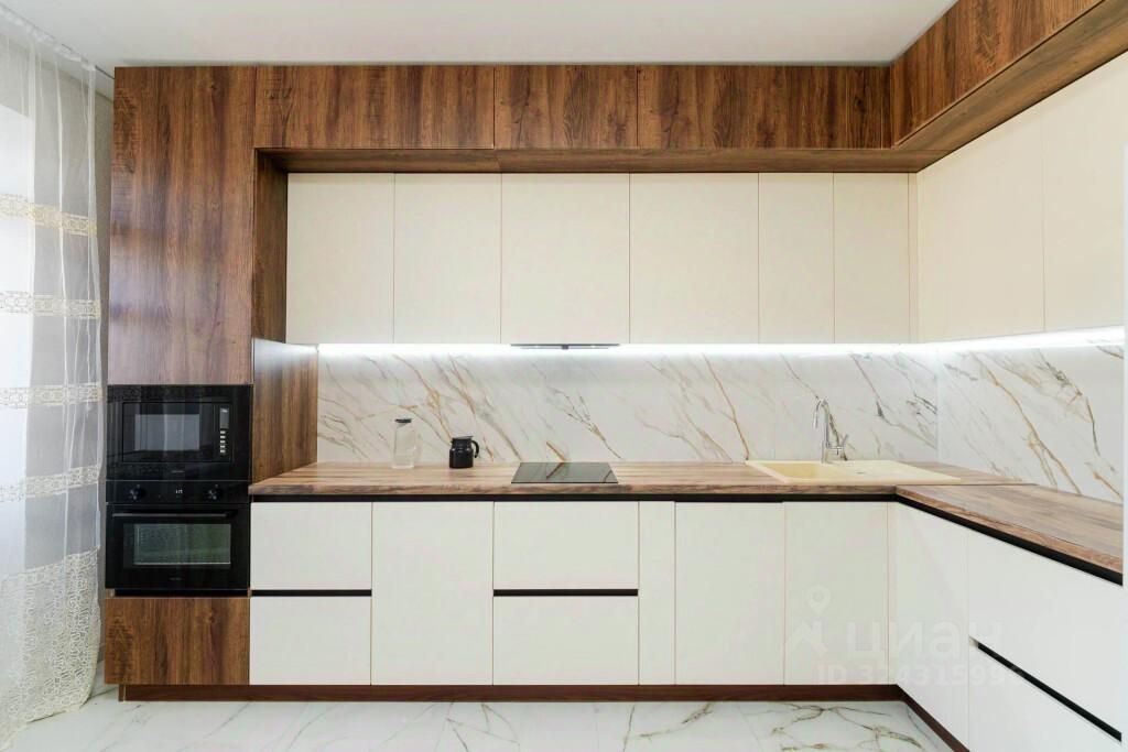 Кухня-гостиная светлая и полностью готова к использованию: установлен кухонный гарнитур со встроенной духовкой, варочной панелью, холодильником и вытяжкой.