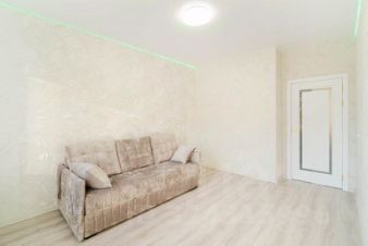 в жилых комнатах светлые, аккуратные обои, натяжные потолки, на полу — ламинат;