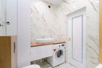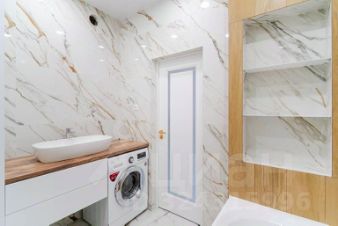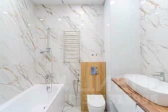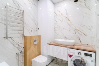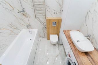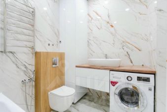 санузел просторный, отделан керамогранитом под мрамор.