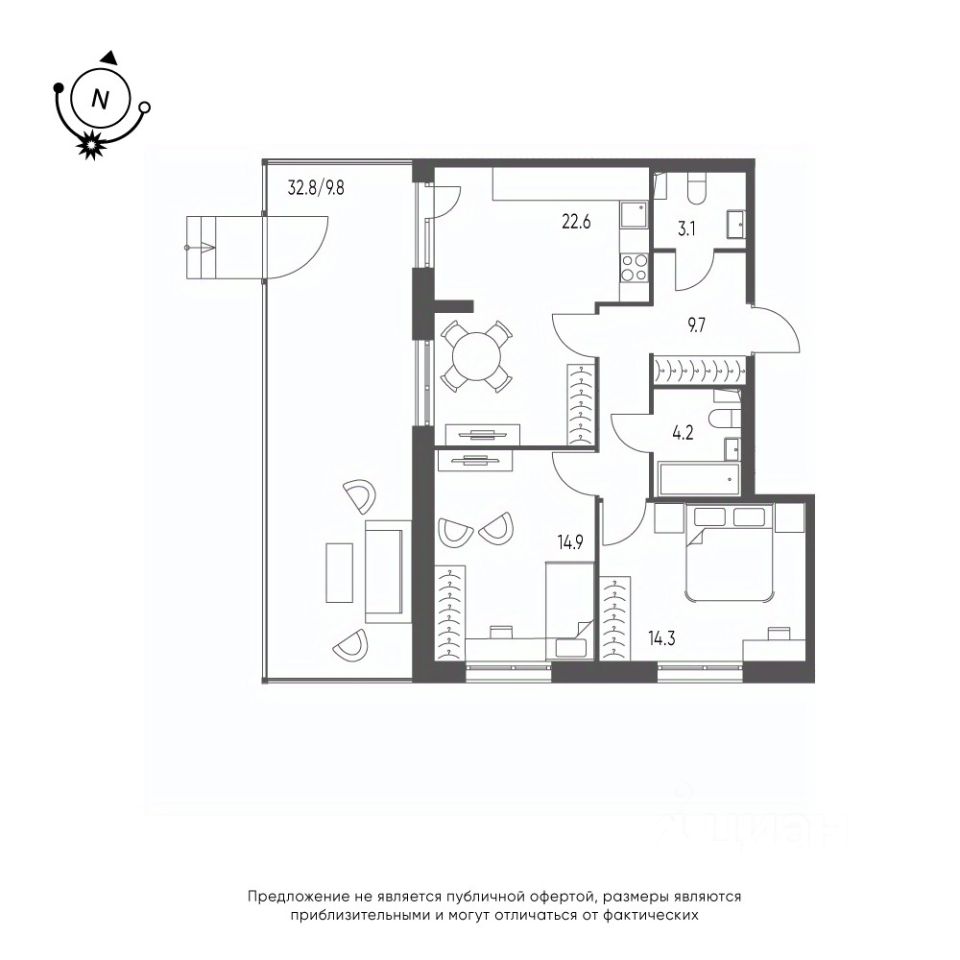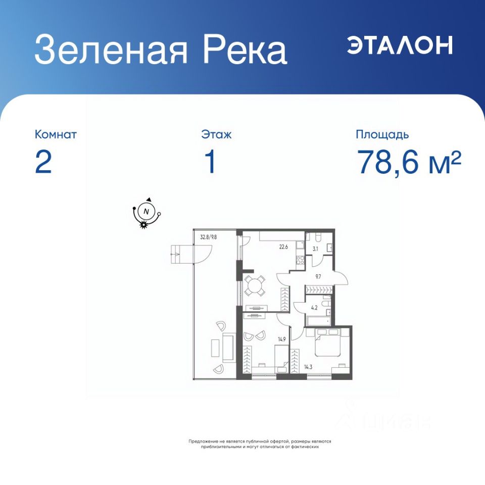 Общая площадь квартиры — 78.6 кв. м, этаж 1 из 9.