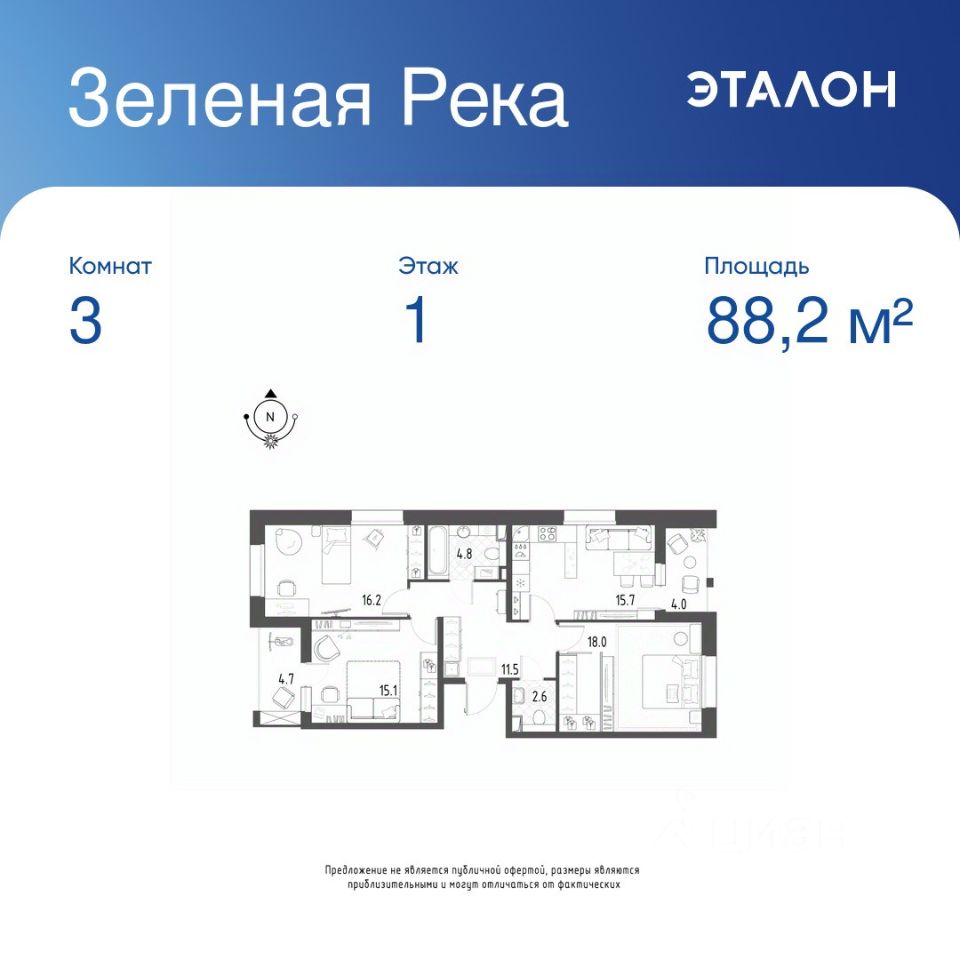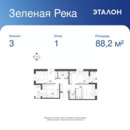 Общая площадь квартиры — 88.2 кв. м, этаж 1 из 7.