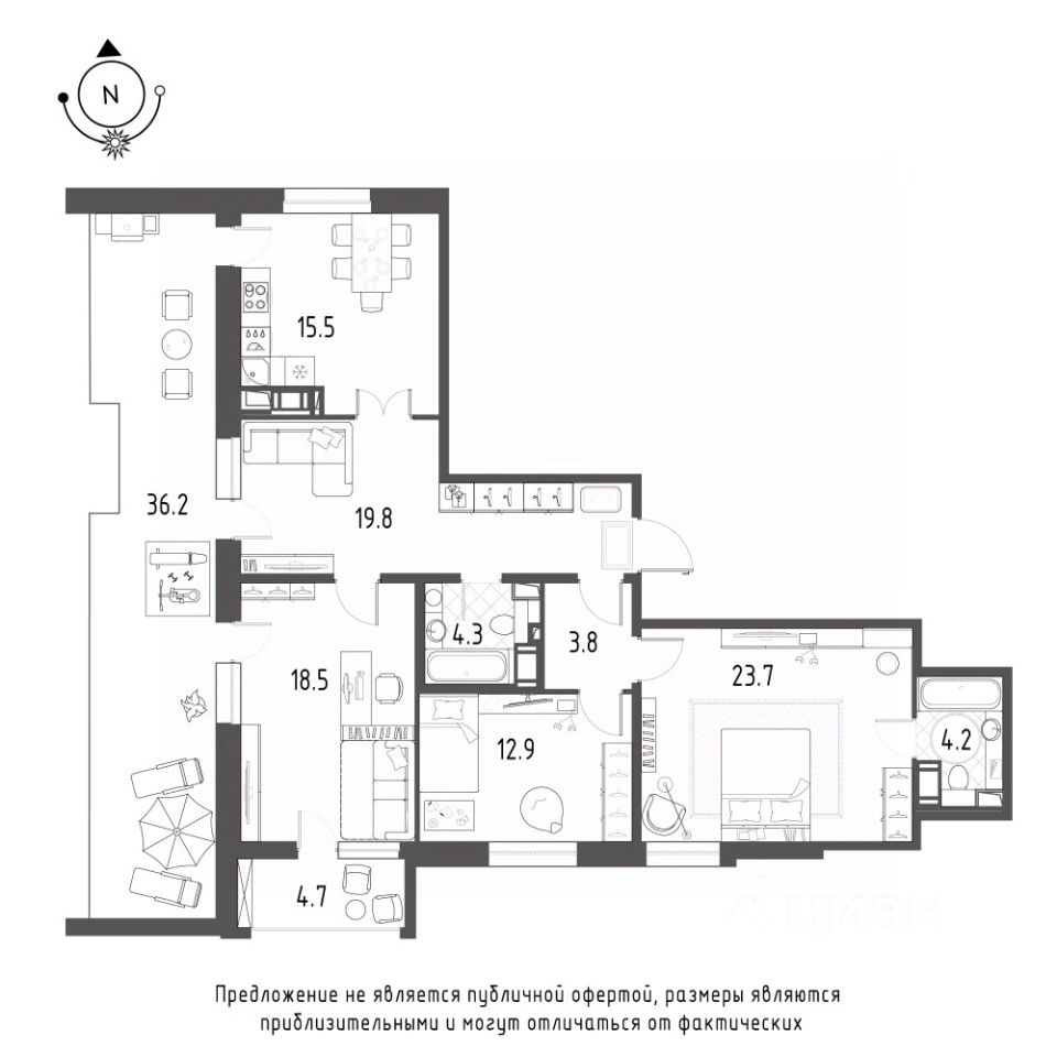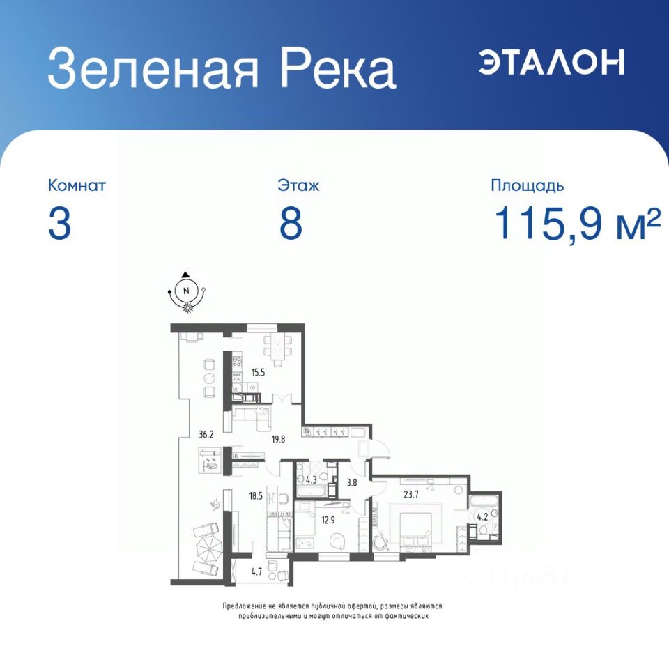 Общая площадь квартиры — 115.9 кв. м, этаж 8 из 9.
