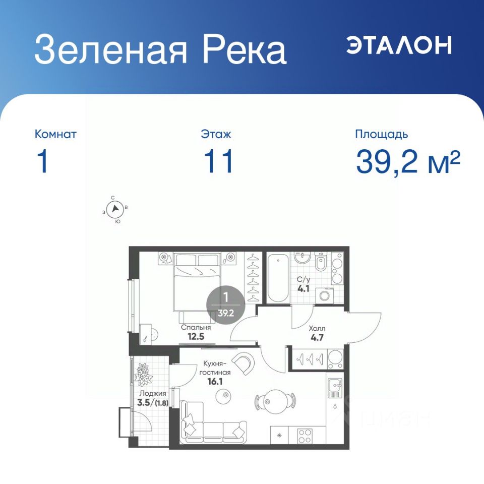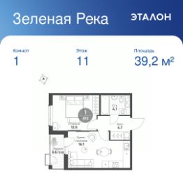 Общая площадь квартиры — 39.2 кв. м, этаж 11 из 12.