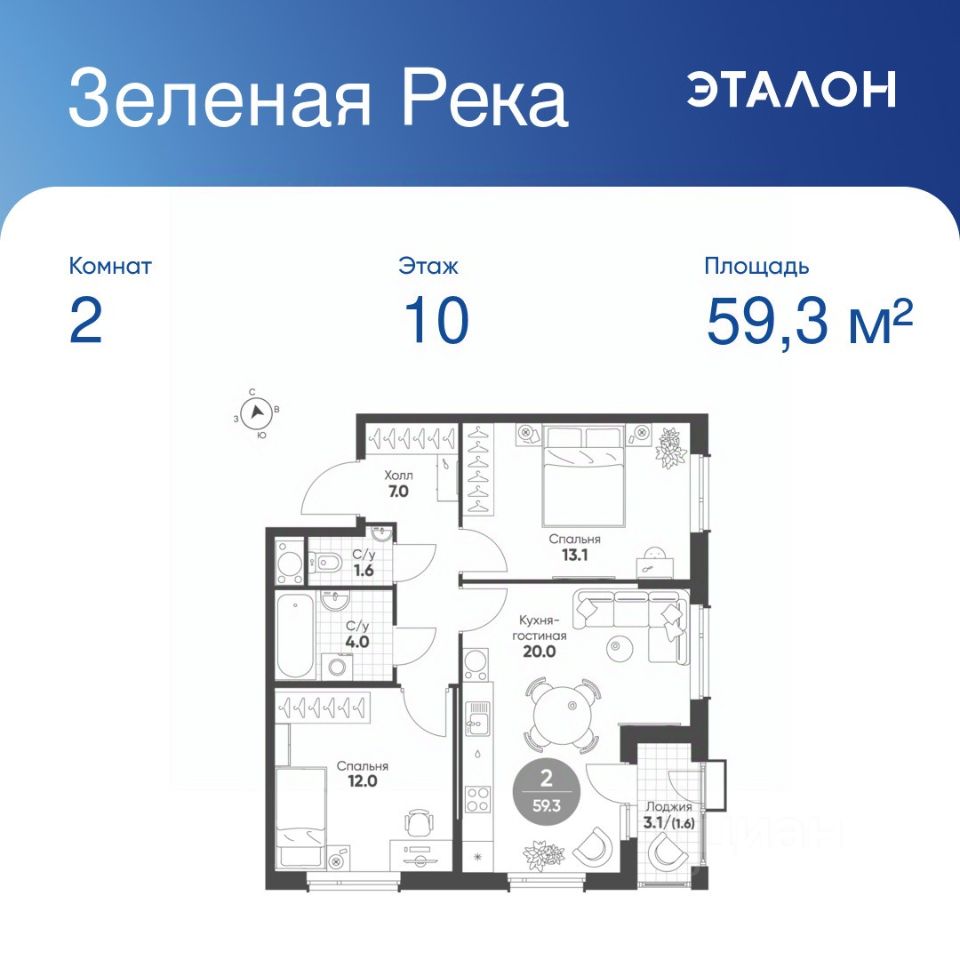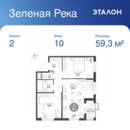 Общая площадь квартиры — 59.3 кв. м, этаж 10 из 10.