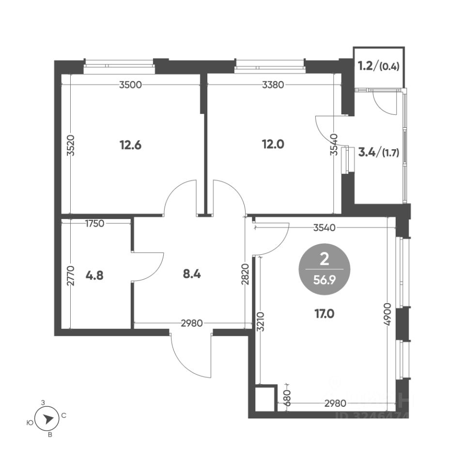 Общая площадь квартиры — 56.9 кв. м, этаж 2 из 3.
