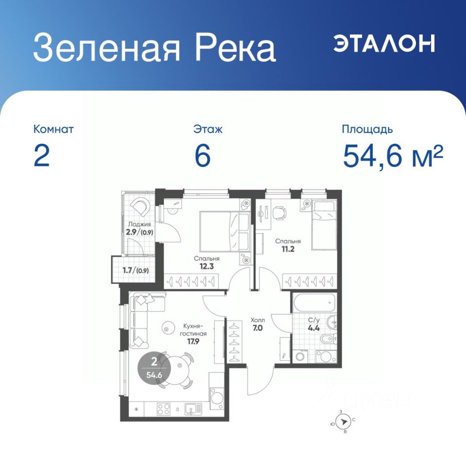 Общая площадь квартиры — 54.6 кв. м, этаж 6 из 7.