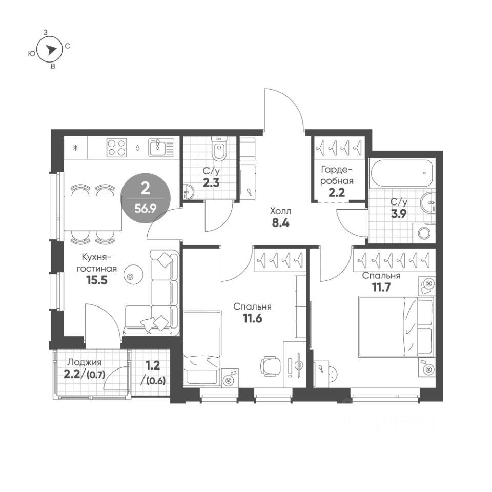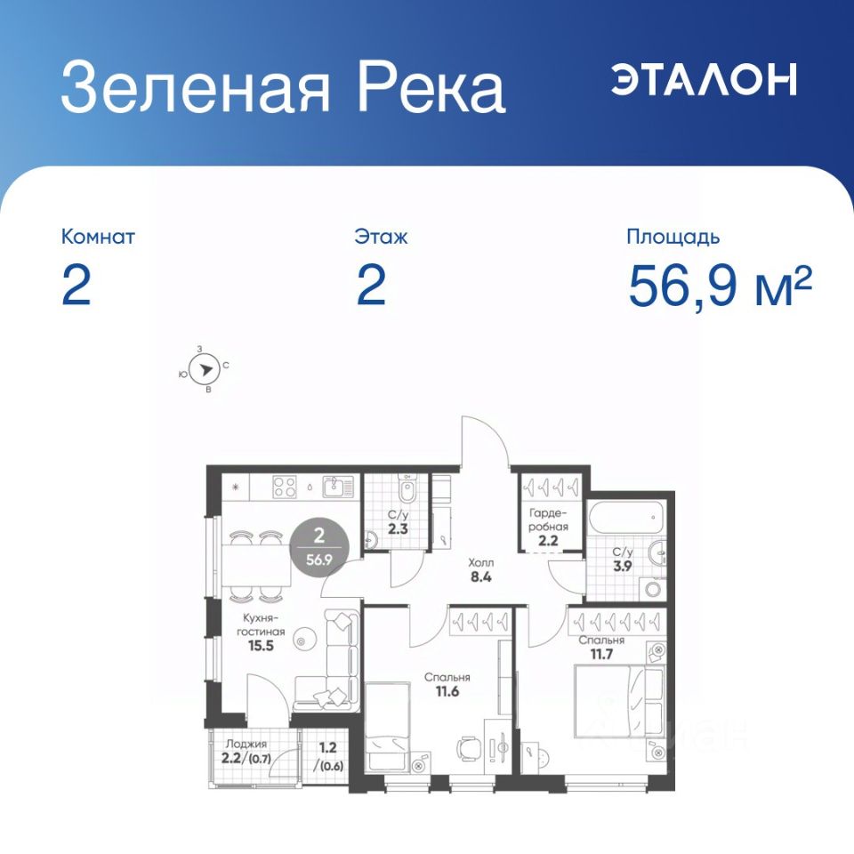 Общая площадь квартиры — 56.9 кв. м, этаж 2 из 3.