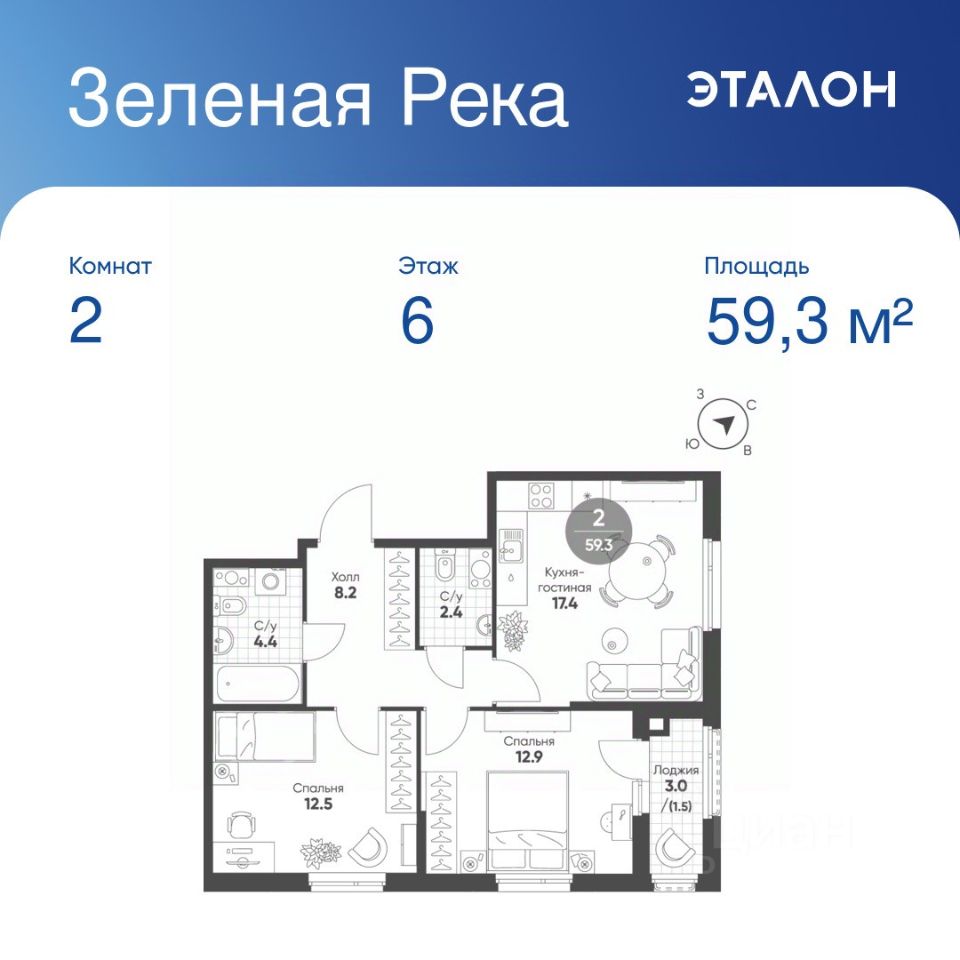 Общая площадь квартиры — 59.3 кв. м, этаж 6 из 11.