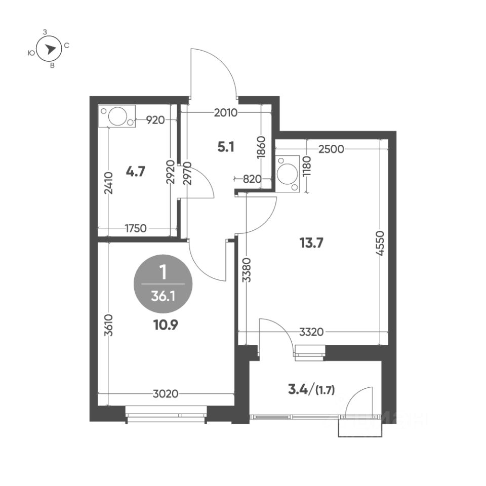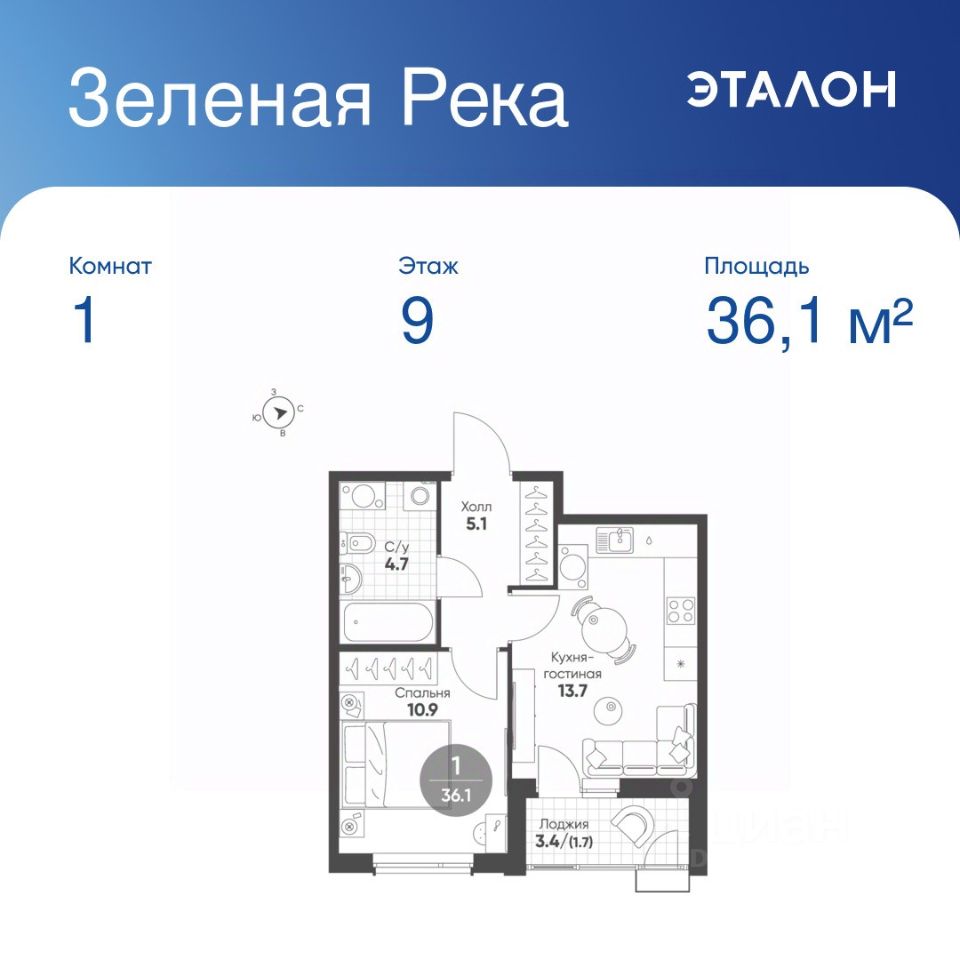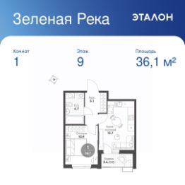 Общая площадь квартиры — 36.1 кв. м, этаж 9 из 10.