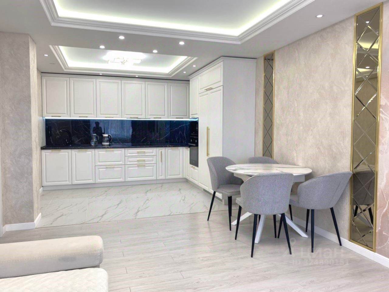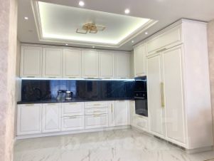 Большая кухня-гостиная — сердце квартиры. Установлен современный кухонный гарнитур со всей необходимой встроенной техникой (варочная панель, духовой шкаф, вытяжка, посудомоечная машина, холодильник). Кондиционер.