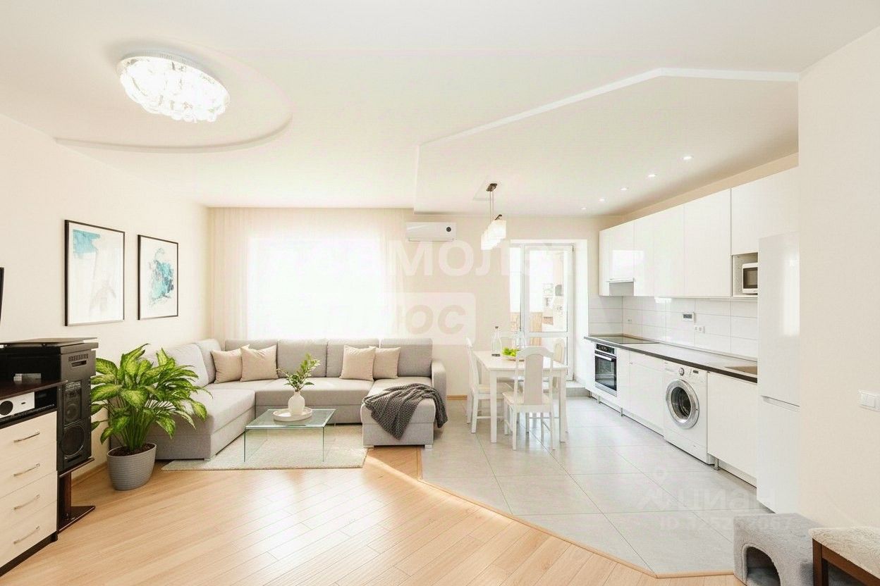 Квартира имеет эргономичную планировку с комнатой-кухней площадью 34,4 м² и дополнительной комнатой 15,5 м². Раздельный санузел. Окна ПВХ в зале и кухне обеспечивают естественное освещение с двух сторон. На полу в жилых зонах ламинат, в зоне кухонного гарнитура плитка. Установлены натяжные потолки.