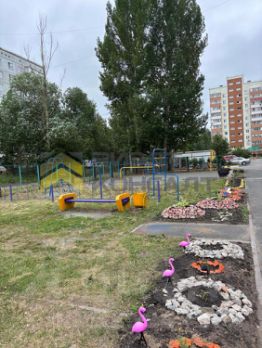 Двор тихий и ухоженный, много зелени и цветов.