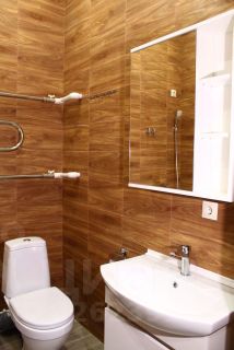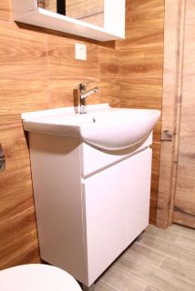 Санузел полностью отремонтирован, на стенах и на полу - современная плитка, установлена необходимая сантехника, сделан вывод для подключения водонагревателя.