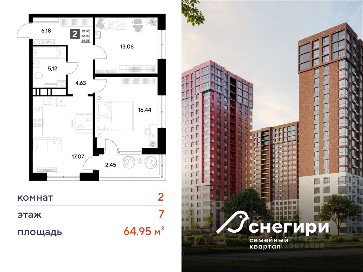 ЖК "Снегири", г. Омск, корпус 2 Срок сдачи: (4 кв. 2027, общей площадью 64.95 кв.м., на 7 этаже.)