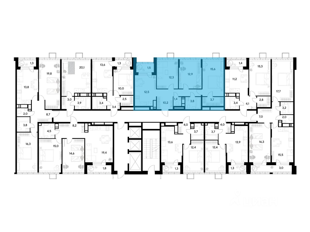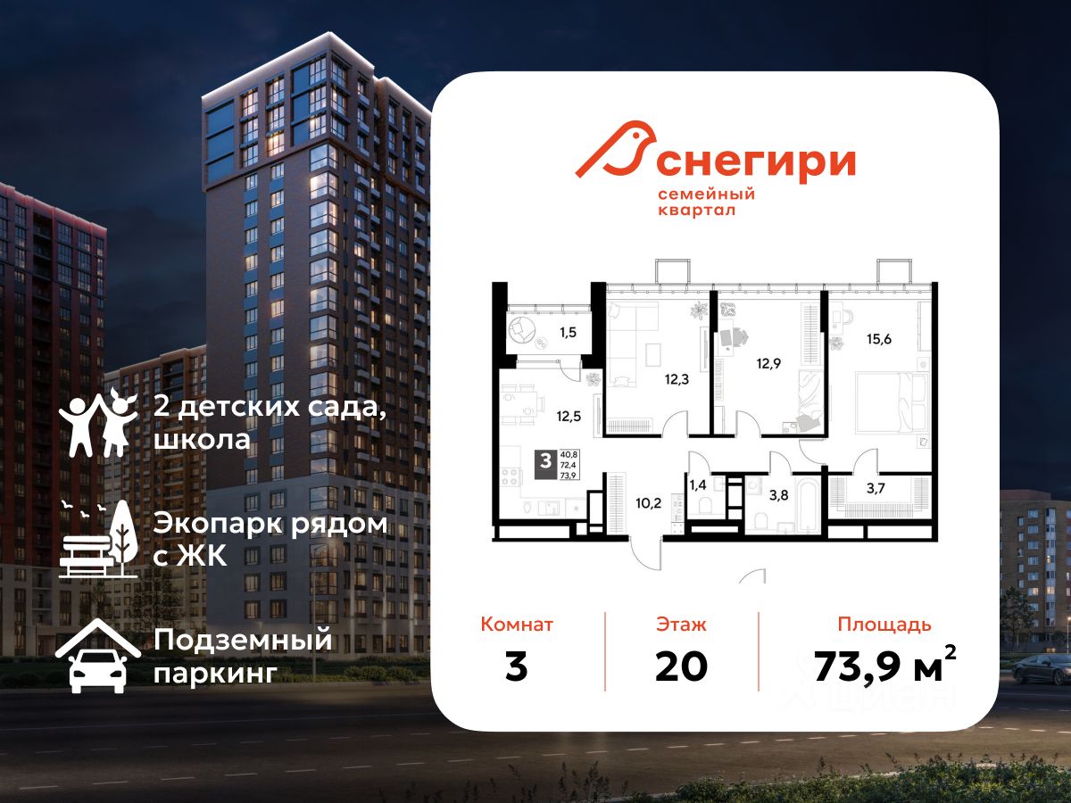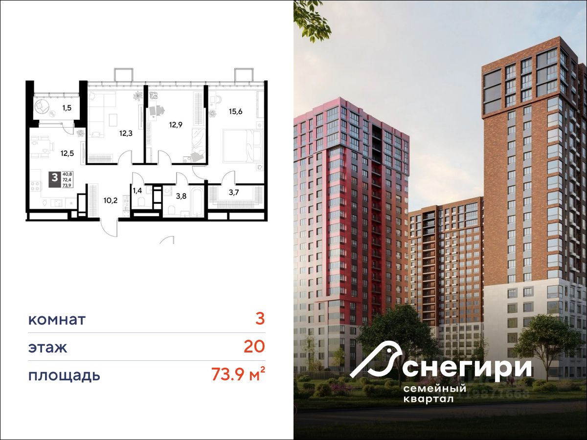 ЖК "Снегири", г. Омск, корпус 1 Срок сдачи: (4 кв. 2027, общей площадью 73.9 кв.м., на 20 этаже.)