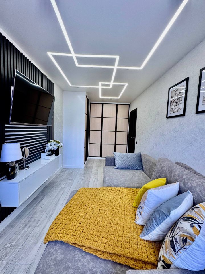 - Натяжные потолки с оригинальной подсветкой в зале.