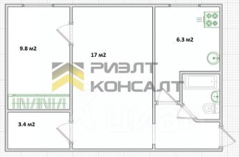 Планировка включает в себя светлую кухню правильной формы площадью 6,3 кв.м, просторную комнату 17 кв.м и комнату площадью 13,2 кв.м, санузел совмещённый.