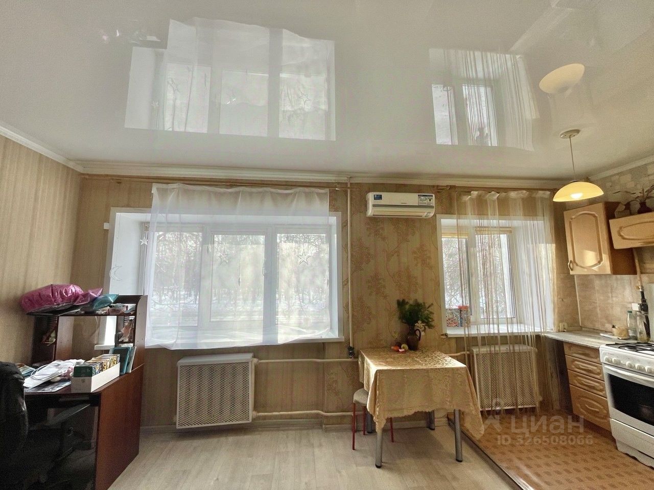 На полу постелен качественный линолеум, потолки натяжные, в ванной кафель и поменяны трубы водоснабжения , установлены счётчики воды и газа. В комнате установлен вместительный шкаф-купе и для летней прохлады кондиционер. На кухне останется кухонный гарнитур.