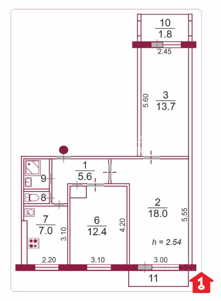Общая площадь составляет 60,3 кв.м, из которых 44,1 кв.м — жилая.