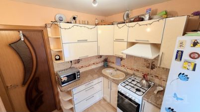 Кухонный гарнитур, со всей необходимой техникой. Санузел облицован плиткой, установлен водонагреватель.