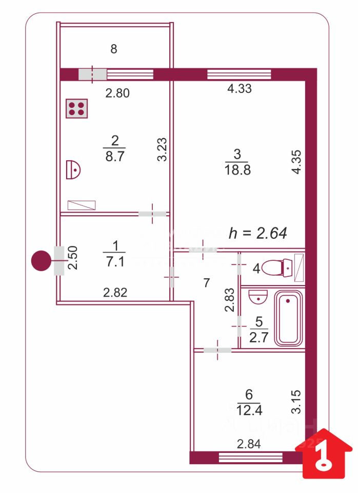 Комнаты все изолированы, кухня - 8.7 кв.м с кухонным гарнитуром и выходом на застекленную лоджию. Гостиная - 18.8 кв.м, спальня - 12.4 кв.м, вместительная прихожая - 7.1 кв.м со встроенным шкафом-купе. В квартире стоят приборы учета воды и электричества.