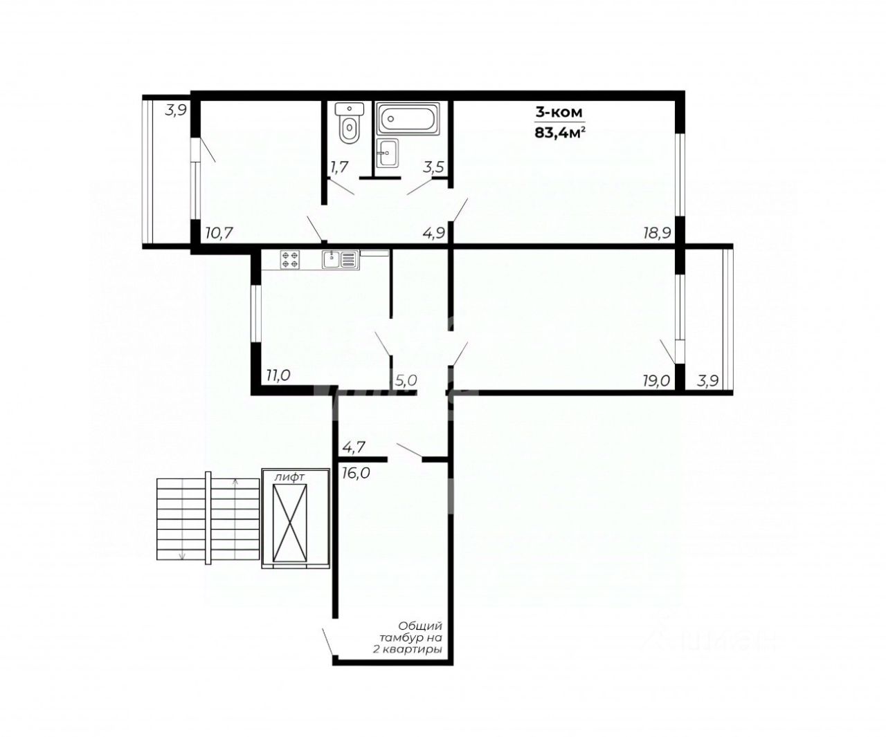 Простор и комфорт (83.4 м²): Три изолированные комнаты, раздельный санузел. Огромный общий тамбур (19 м²) на две квартиры с местом для хранения — дополнительное полезное пространство! Две лоджии на восток и запад — целый день светло и уютно.