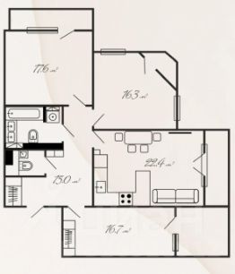3 изолированные комнаты и большая кухня-гостиная.