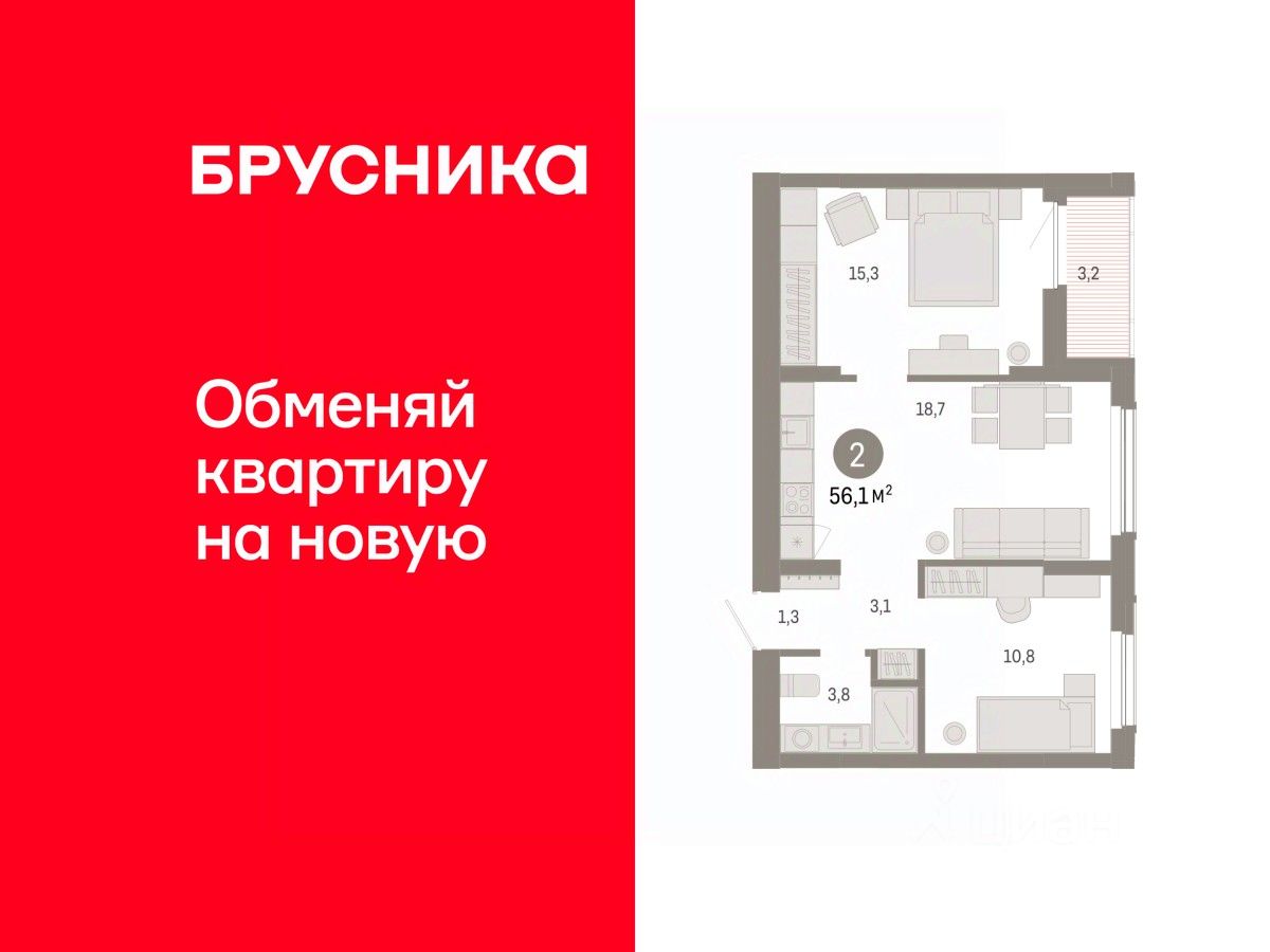 Продается 2-комн. квартира, 56,09 м²